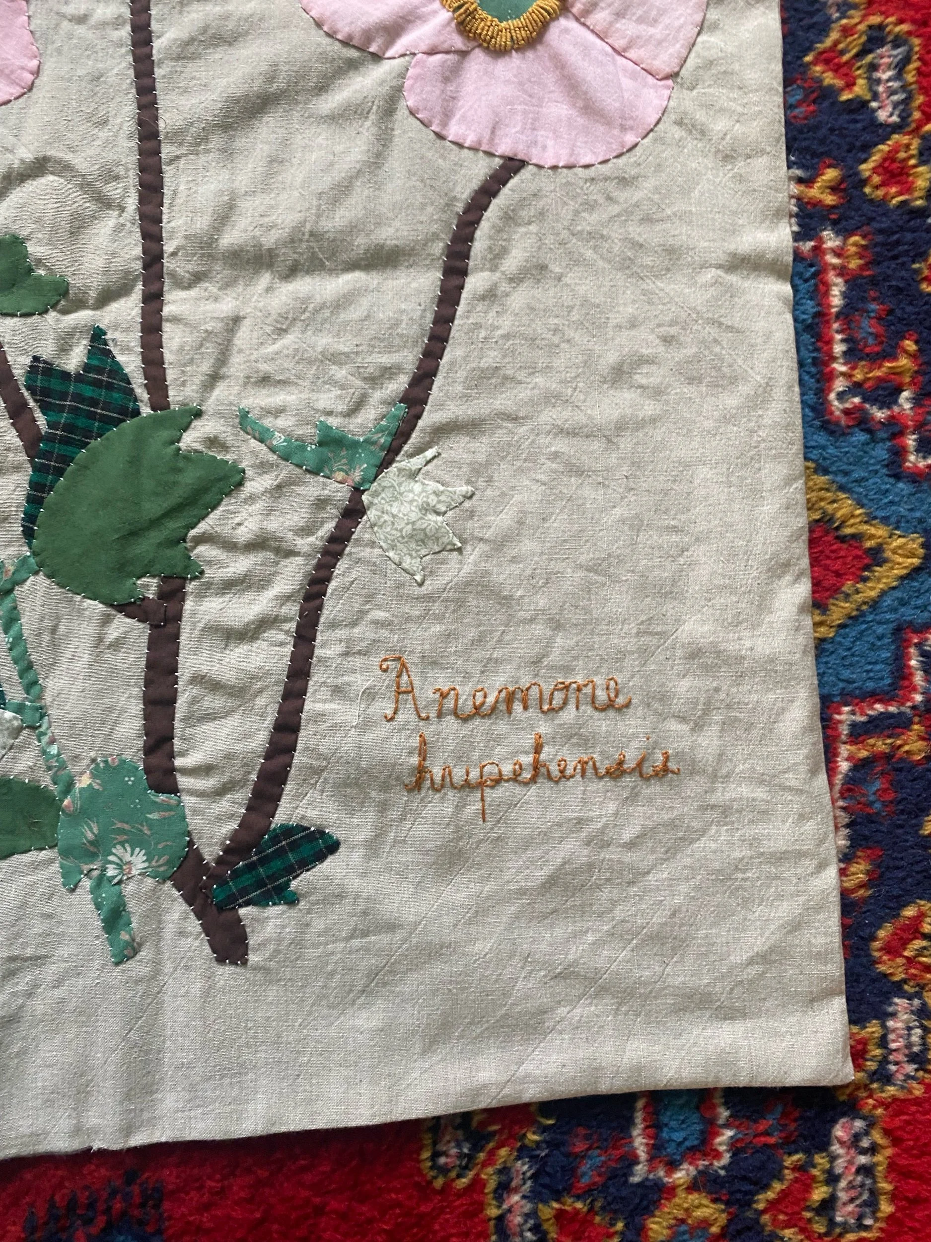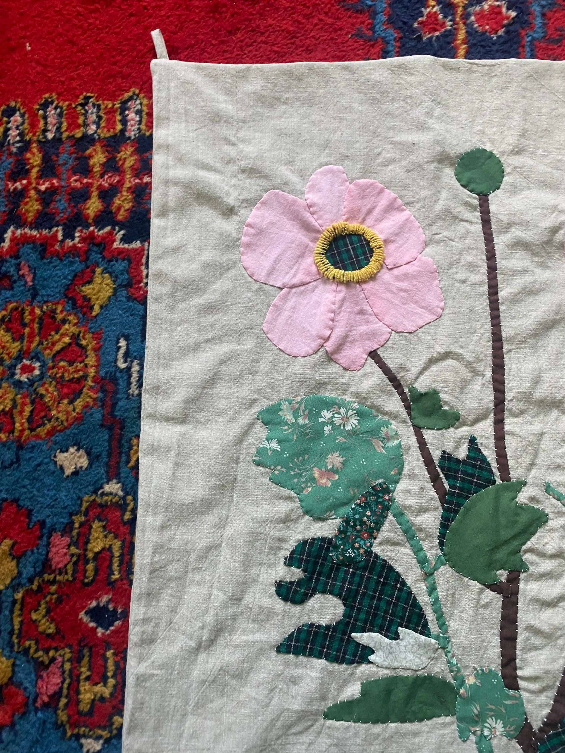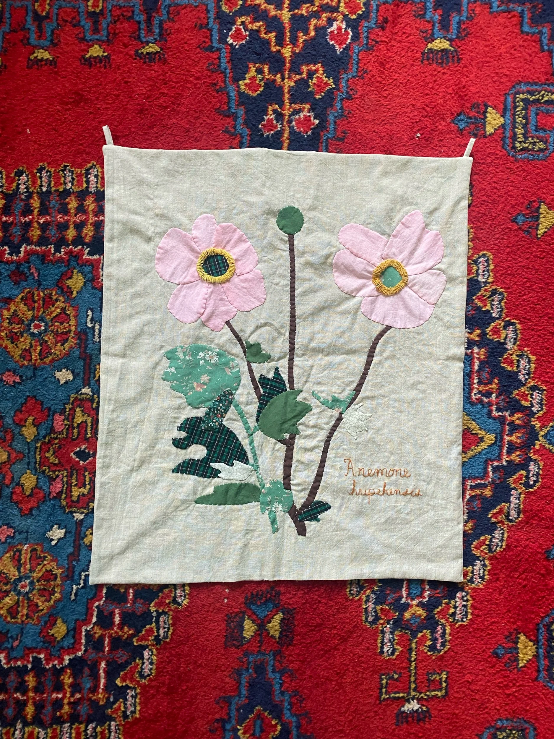 Hand sewn wall hanging of Anemone hupehensis (Japanese anemone). Made from a patchwork of upcycled and repurposed fabrics hand stitched onto a linen background. Solid linen backing and two loops for hanging. Handmade in Buffalo, N.Y.