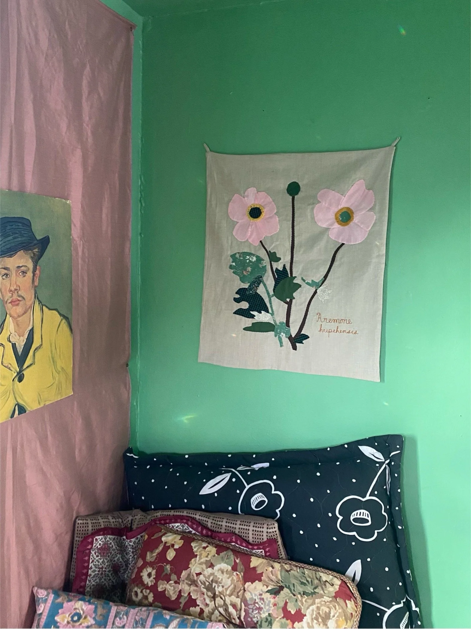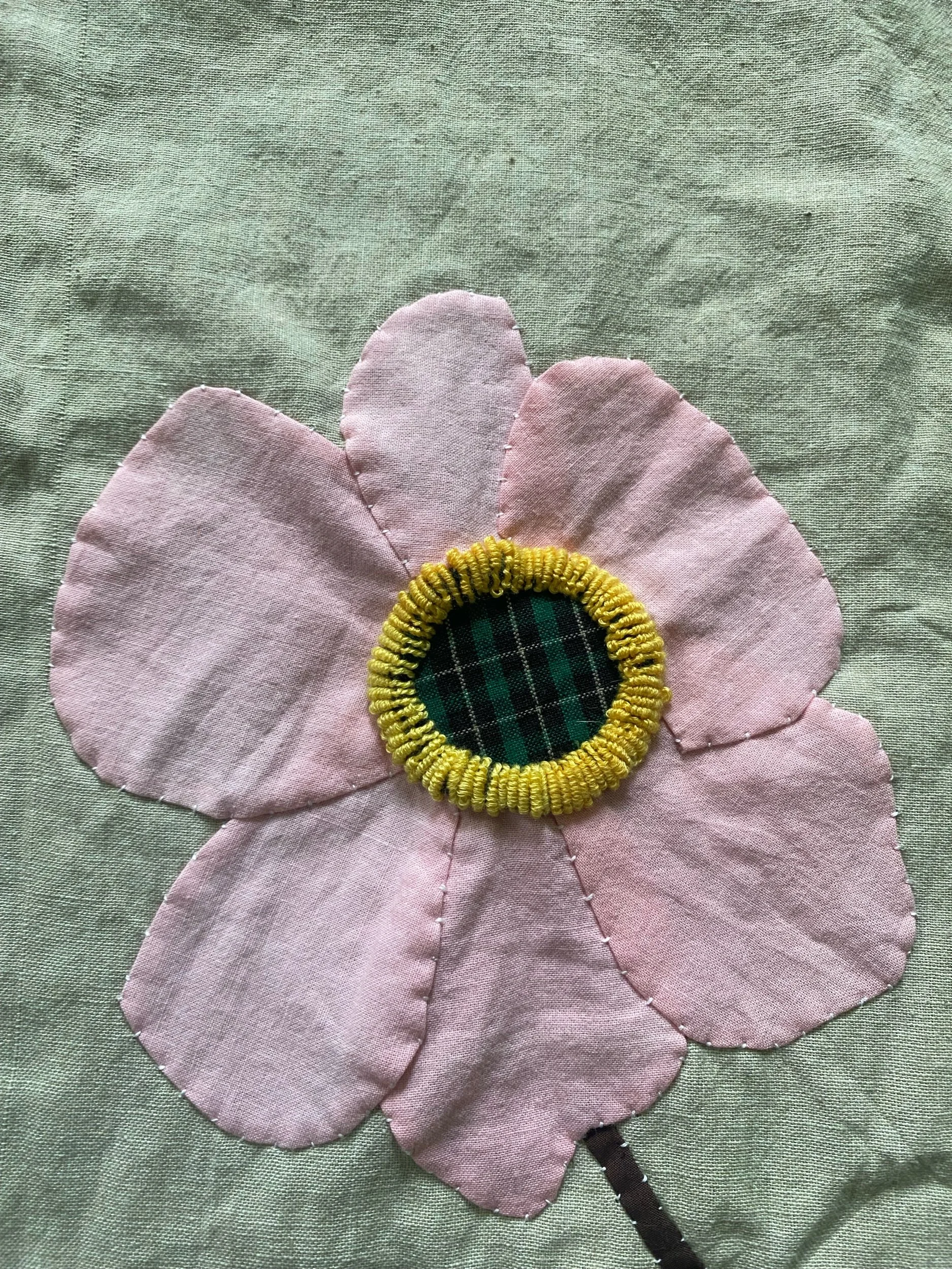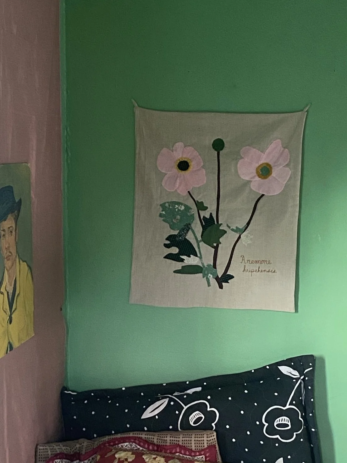 Hand sewn wall hanging of Anemone hupehensis (Japanese anemone). Made from a patchwork of upcycled and repurposed fabrics hand stitched onto a linen background. Solid linen backing and two loops for hanging. Handmade in Buffalo, N.Y.